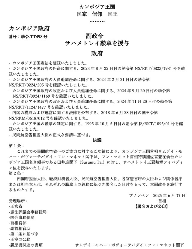 このたび弊社との間でコンソーシアム協定を締結させていただきました在仙台カンボジア王国名誉領事館 田井 進名誉領事が、10/20 にカンボジア新空港 テチョ国際空港 (Techo International Airport)開港式典の際カンボジア王国政府より国家勲章を授与されることとなりました。心よりお祝い申し上げます。